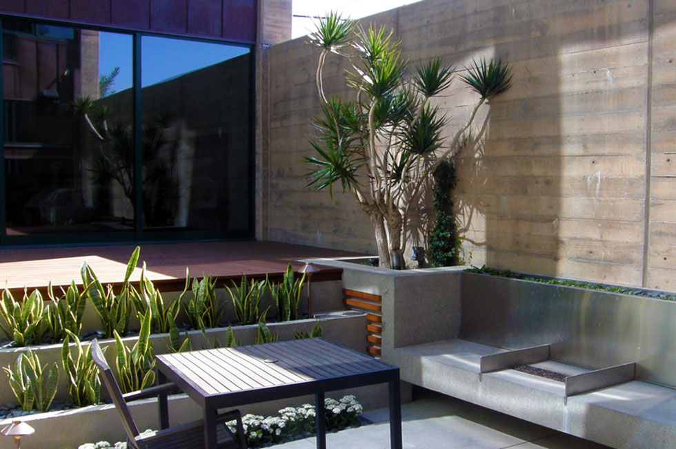 • Designed by Alcorn & Benton Architects, the modernist architectural emphasizes quiet clarity of materials and form, and extends throughout (including contrasting materials – e.g. rough, board-formed concrete against polished stone). Other design elements—such as barrel vaults, structural glass mullioned walls, and steel frame sunshades—capitalize on daylight as an architectural element, complemented by a textured landscape of flowers, bamboo, bougainvillea, and ficus.
